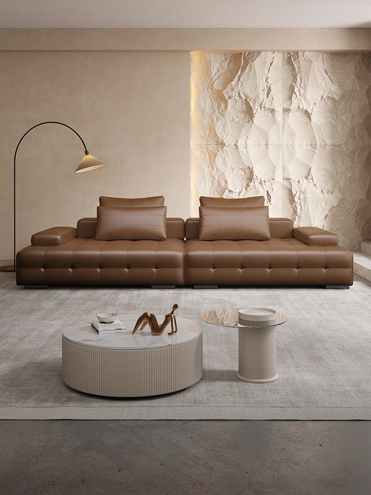 イタリアンミニマルスタイルのローレンスナッパ本革リビングソファ、厚手の牛革使用、モジュール式デザインで豪華なヴィラや広々としたフラットにぴったり、クリーミーカラーで洗練された空間を演出!