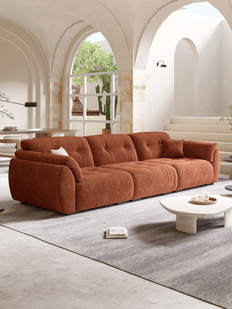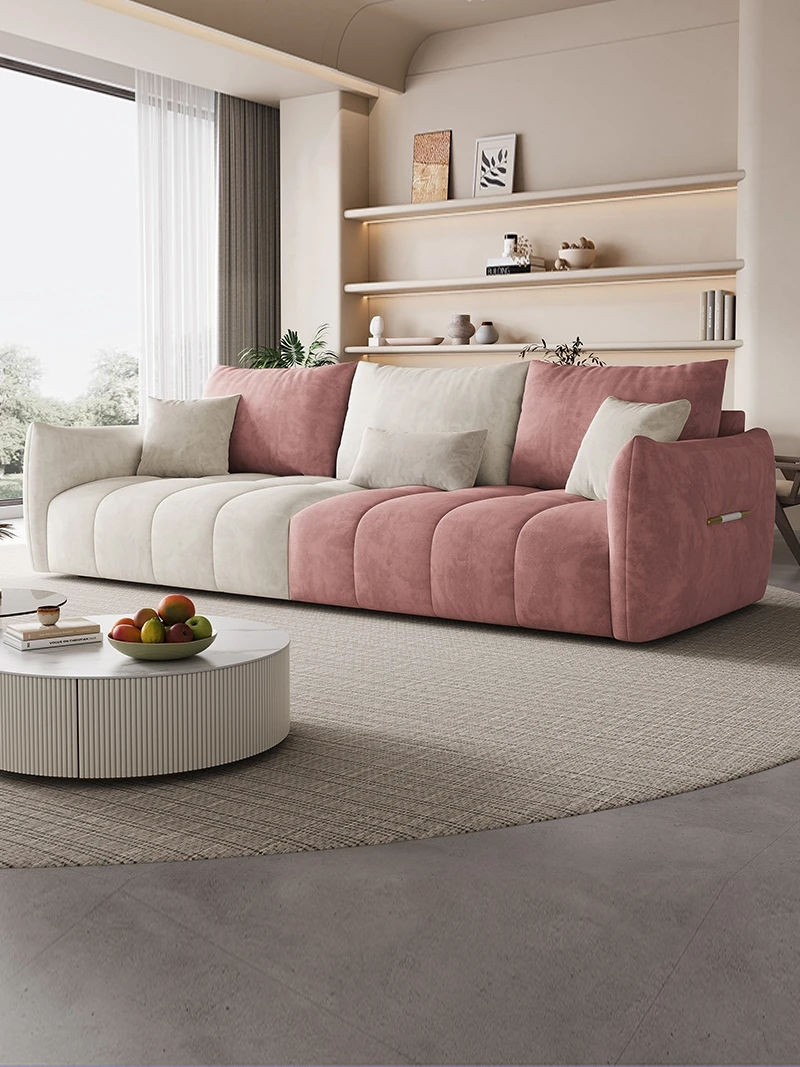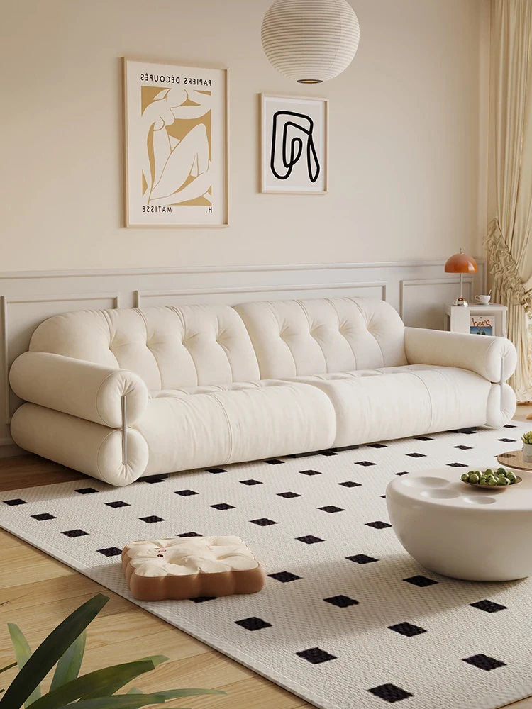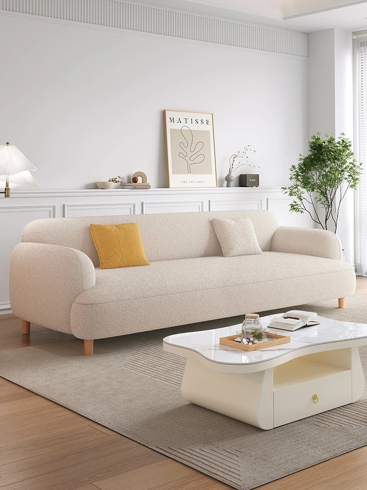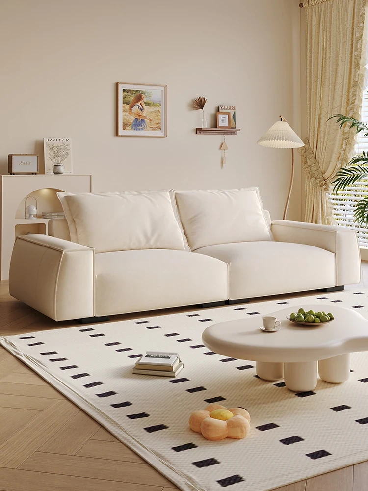 モダンミニマリストなクリーム風親肌高級フロッキーファブリックソファー|アパートメントリビング向けのコンパクトな雲のようなストレートソファーで、心地よいひとときをお楽しみください!