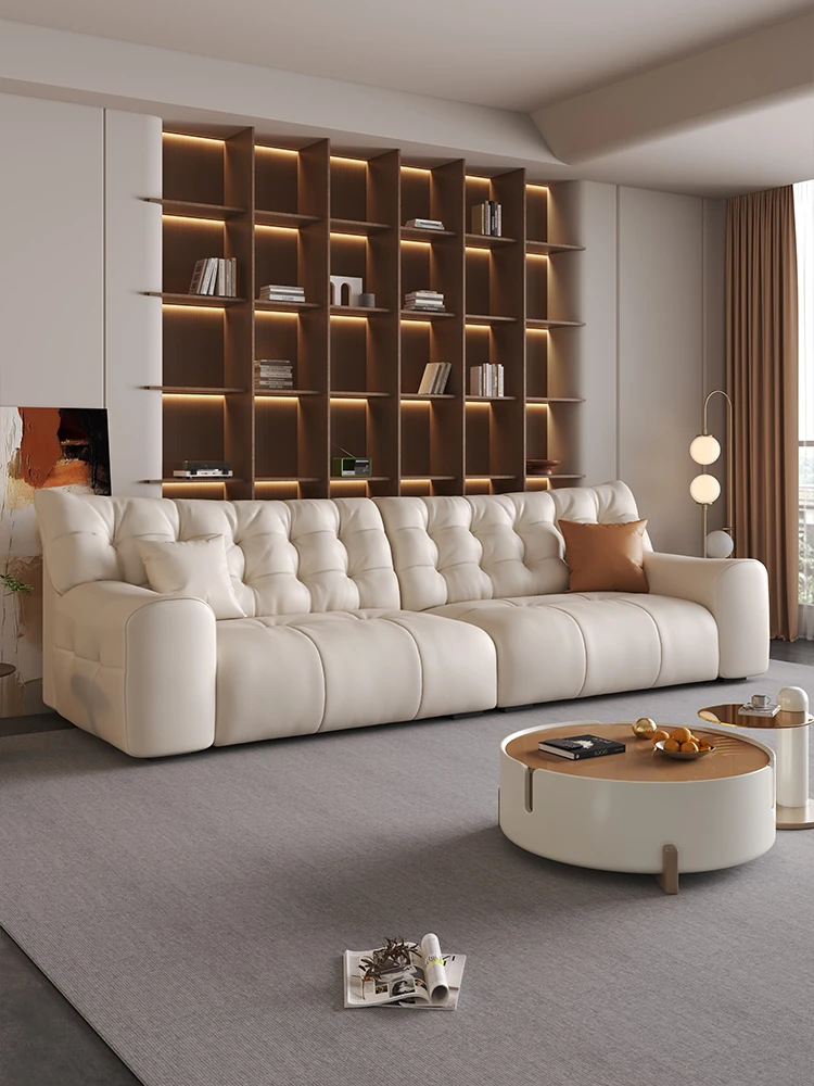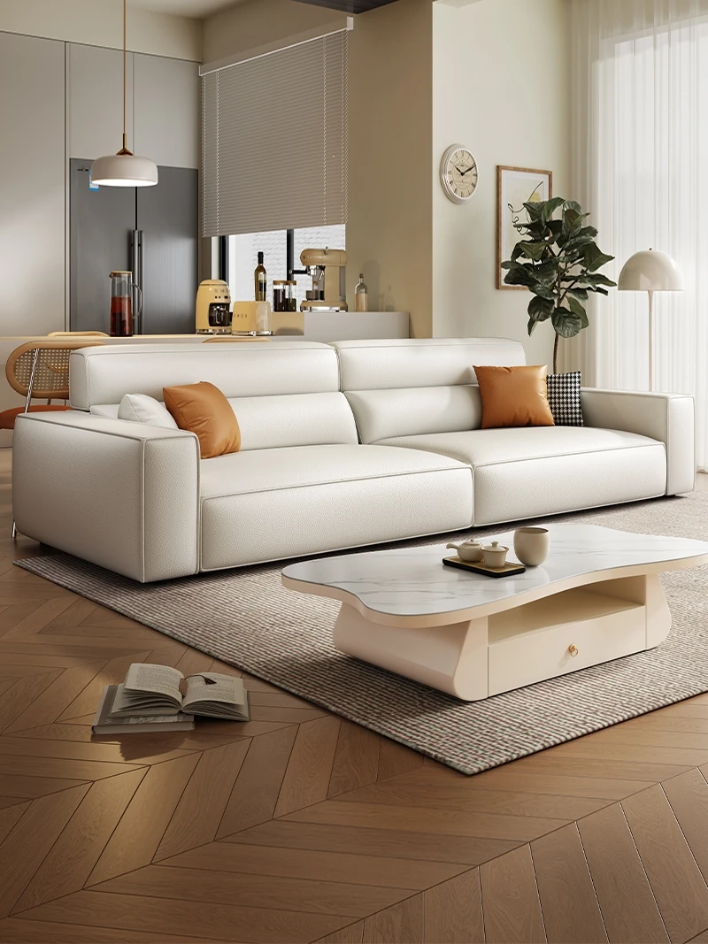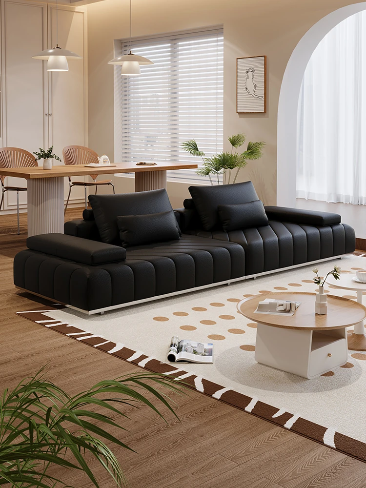 イタリアンミニマリズムの真皮ソファ、リビングに最適な軽奢スタイル!調節可能な高い背もたれで、小さな部屋にもぴったりな直排デザイン。優雅な空間を演出します!