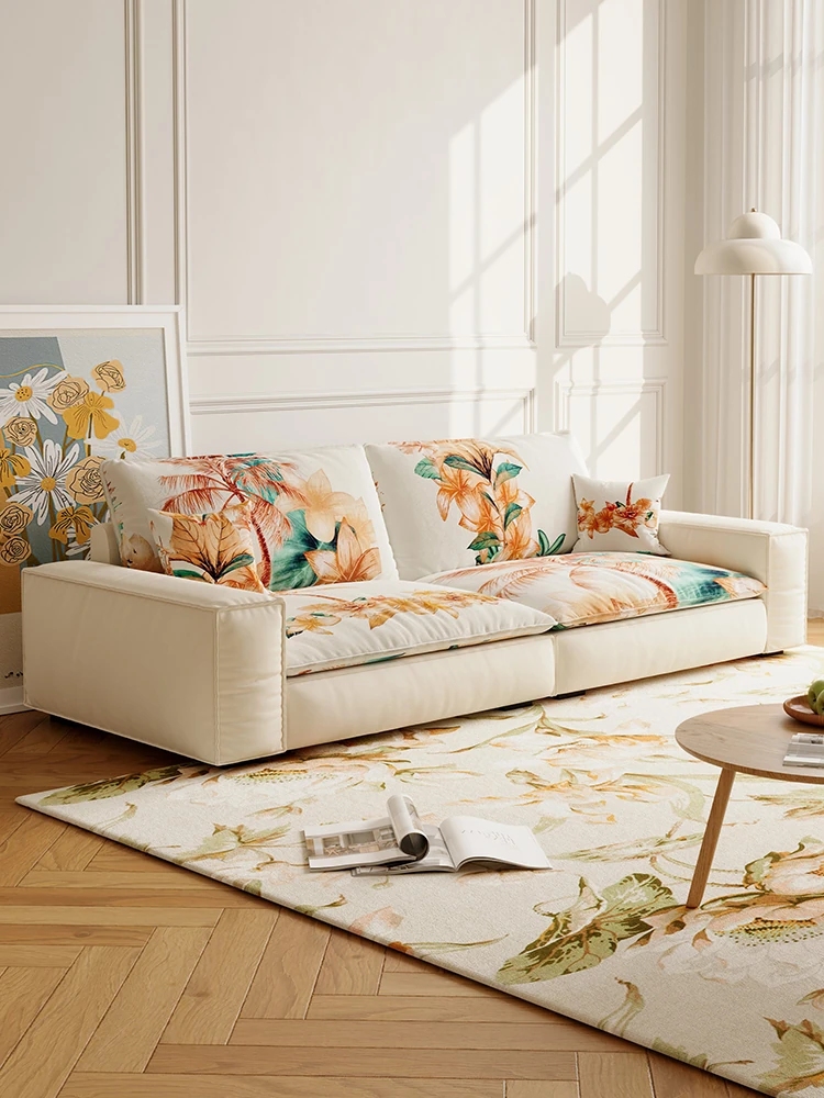 国潮風の感触を持つ豆腐ブロック型リビングソファ、中国風の印刷デザイン、雲のようなラテックス粒子の直排布スタイル。あなたのリビングを華やかに彩る、快適さと美しさを兼ね備えた一品!
