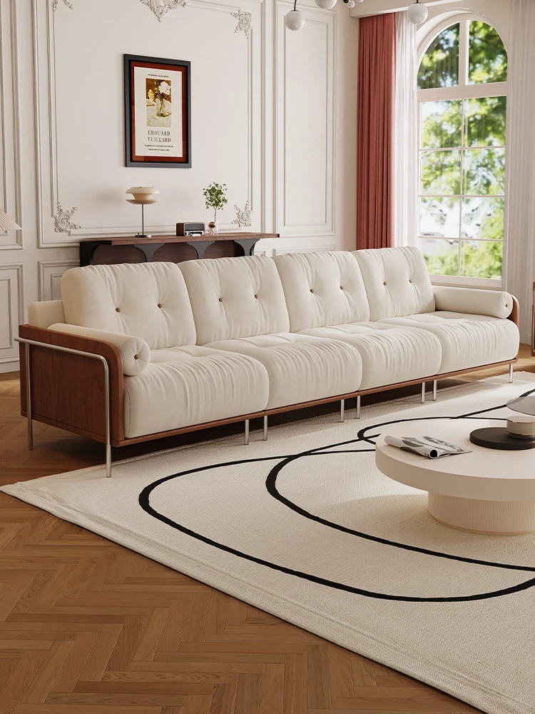 フランス風クリーム色の高背布張りソファ、ヴィンテージスタイルの2025年新作!小さなリビングにぴったりな直線デザインで、優雅さと快適さを兼ね備えたおしゃれなインテリアを演出します。