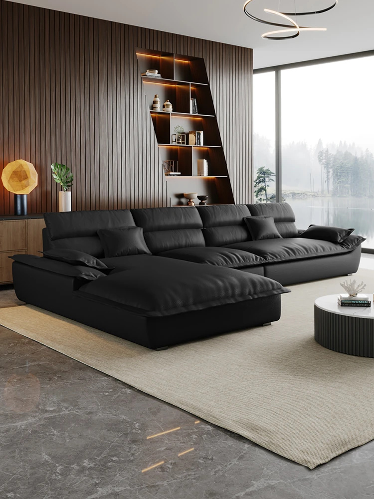 新作!イタリアンミニマリズムのリビング用セーリングソファ。ラグジュアリーなデザインの新型カウチソファ、ビッグブラックベアレザー仕上げで、優雅なくつろぎ空間を演出します。