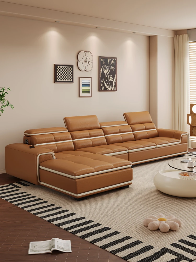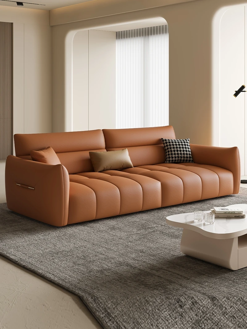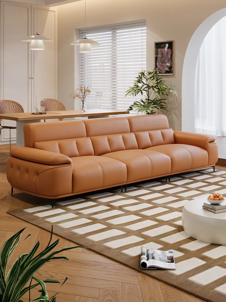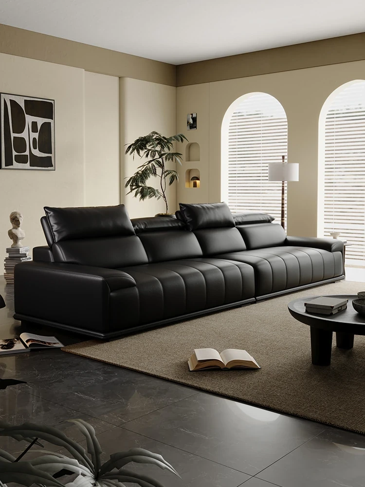 イタリアンミニマルスタイルの高背リビング用レザーソファ、調節可能なヘッドレスト付き!現代的なシンプルデザインで、ピアノキーのような直線的な美しさを追求。快適さとスタイルを兼ね備えた一品です!