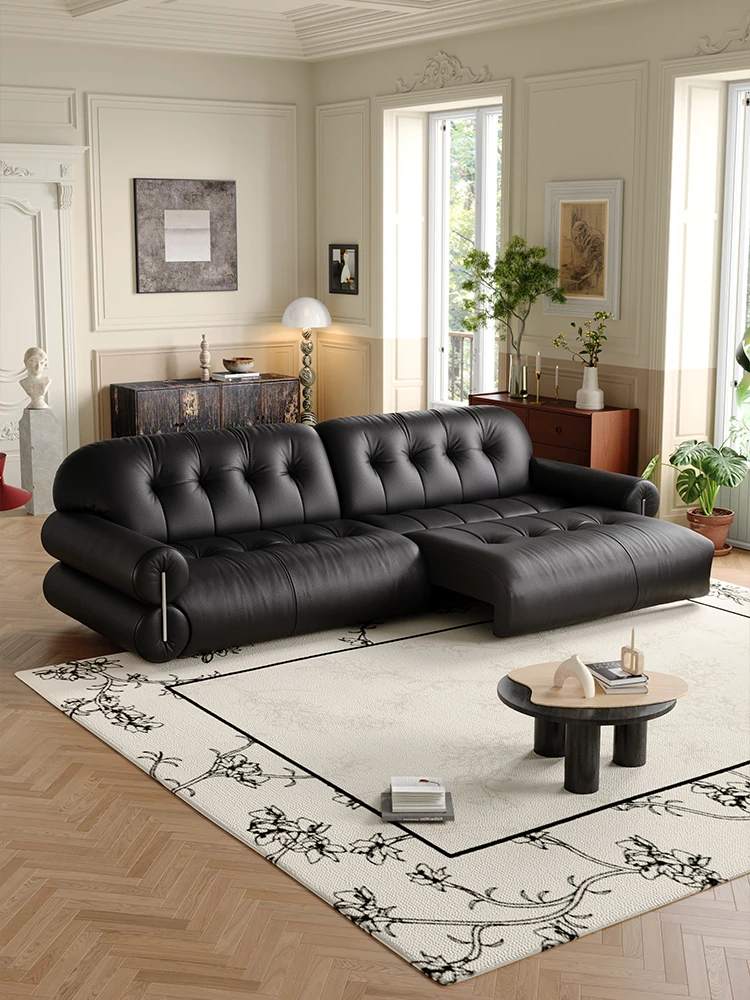 フランス風レトロデザインのハイバックブラックシュガークラウドリビングソファ|イタリア製本革使用|小型スペースにもぴったりなストレートタイプのミッドセンチュリーソファで、洗練されたインテリアを実現!