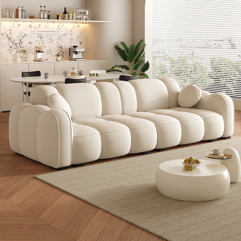 French Cream Puff Marshmallow Sofa - Luxurious Fabric Couch for Small Spaces, Featuring Soft Velvet & Genuine Leather, Perfect for Cozy Living Rooms