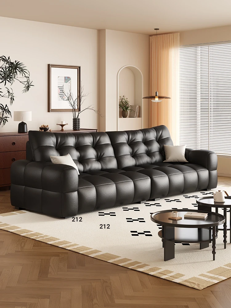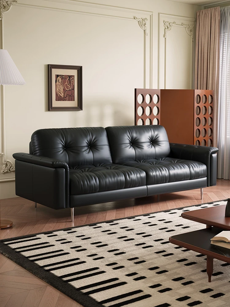 2025 New Vintage French Genuine Leather Sofa - Modern Minimalist Black Couch for Small Living Rooms, Featuring a Unique Celestial Design