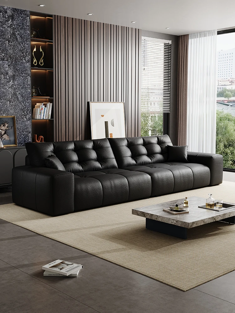 Italian Minimalist Rolled Thick Genuine Leather Sofa - Luxurious Floating Black Chevron Design for Spacious Living Areas