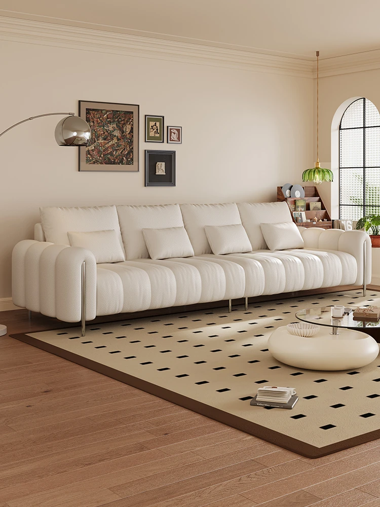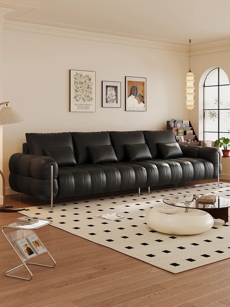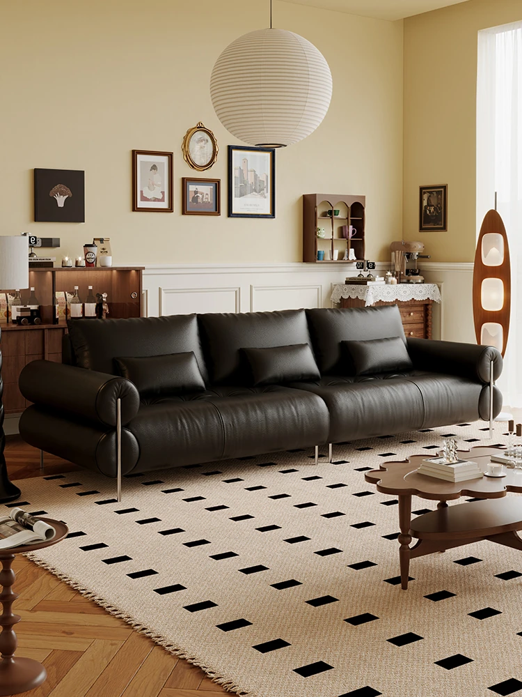 French Vintage Leather Biscuit Sofa - Chic Retro Cotton Candy Straight-Line Sofa for Luxurious Living Rooms - Perfect Blend of Style and Comfort