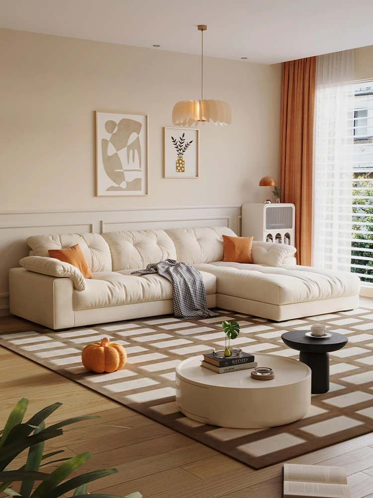French Cream Cloud Puffs Velvet Sofa - Elegant L-Shaped Corner Set for Small Spaces, Modern Minimalist Design