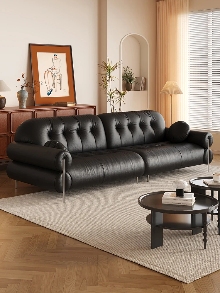 French Vintage High-legged Black Sugar Cloud Sofa - Italian Genuine Leather for Small Spaces, Straight-line Retro Style Living Room Sofa