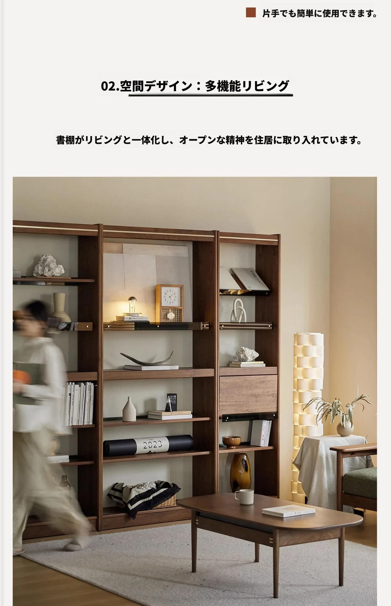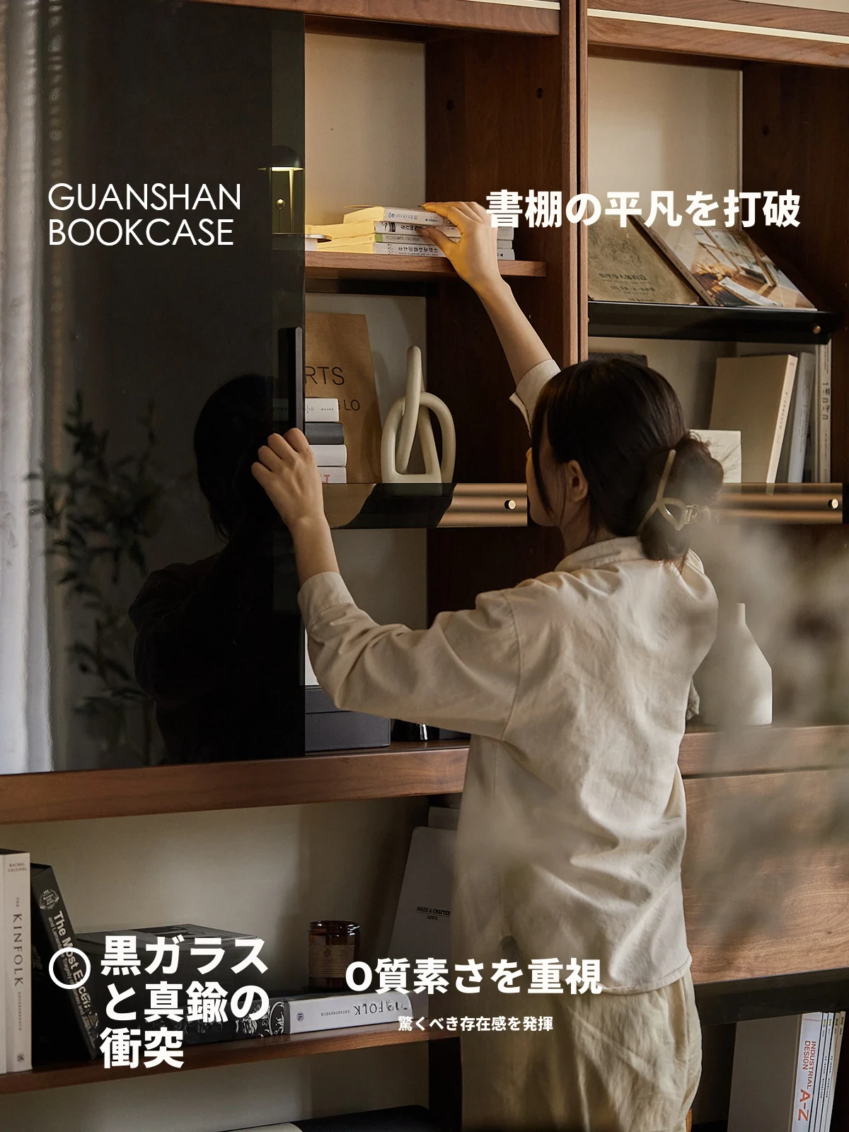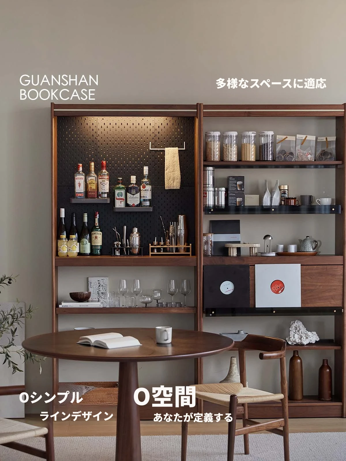 高級感溢れる無垢材の壁面一体型書棚、グラスドア付きのウォールナット書架。収納力抜群で、リビングや書斎に最適なディスプレイキャビネット。魅力的なデザインでお部屋を華やかに演出します。