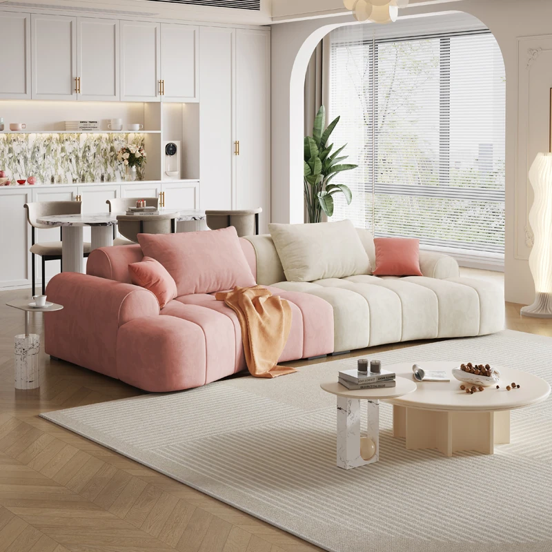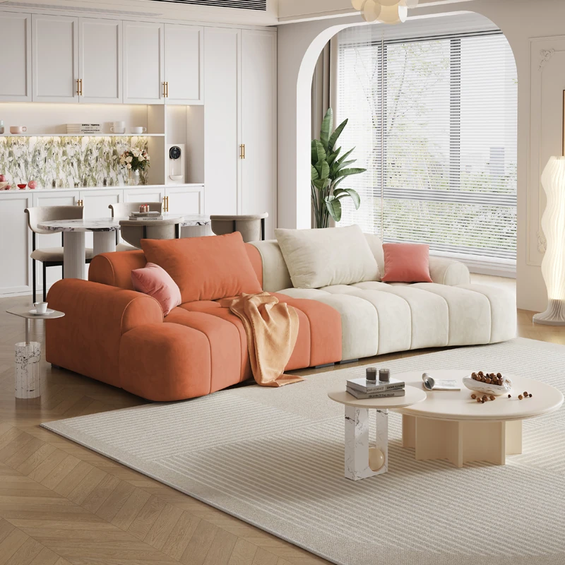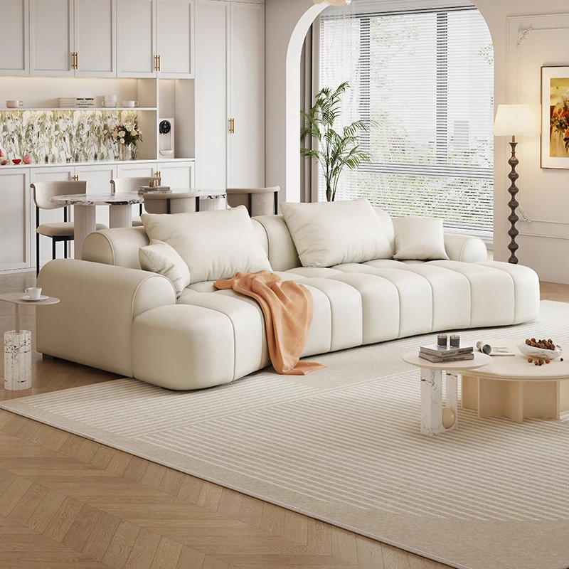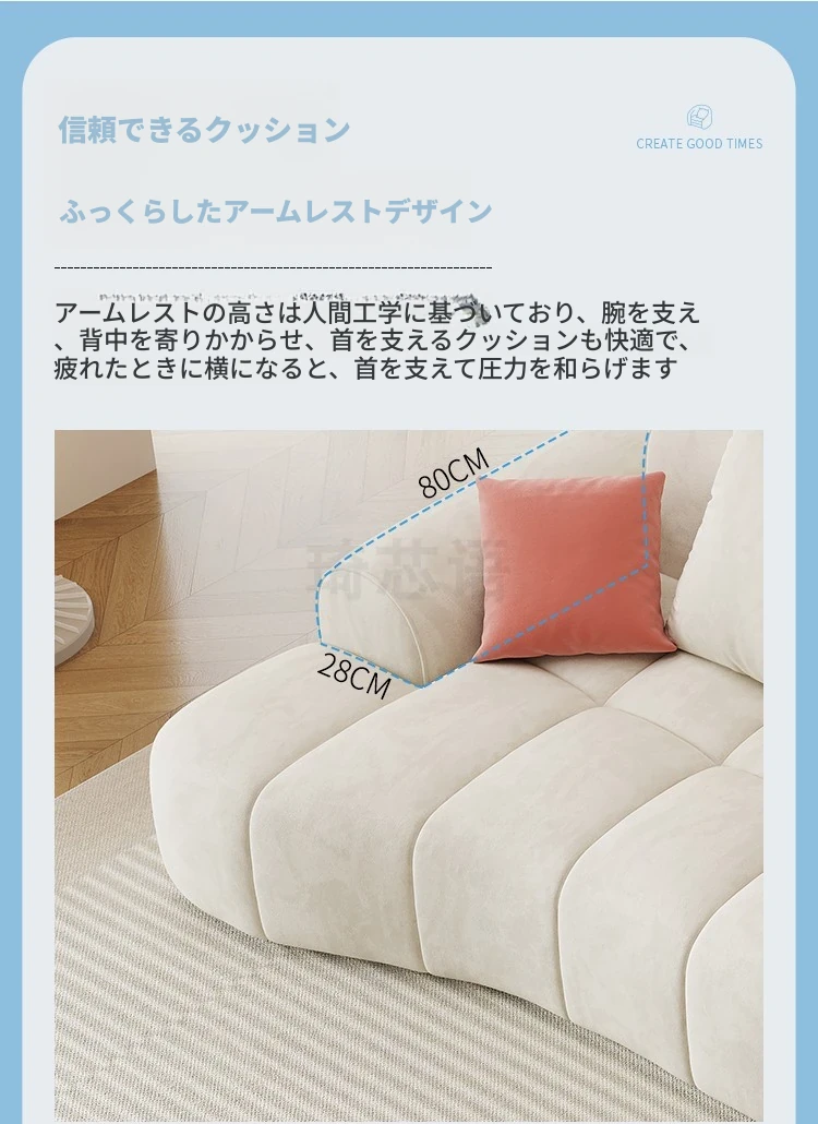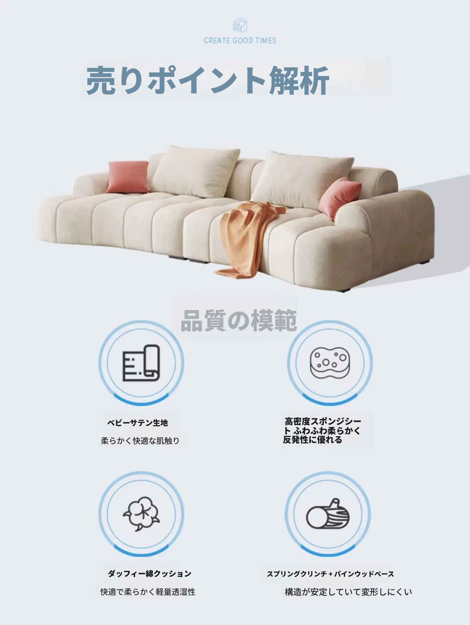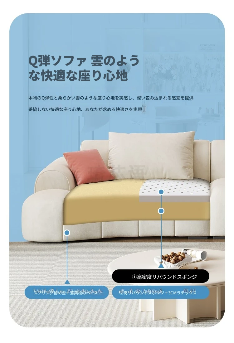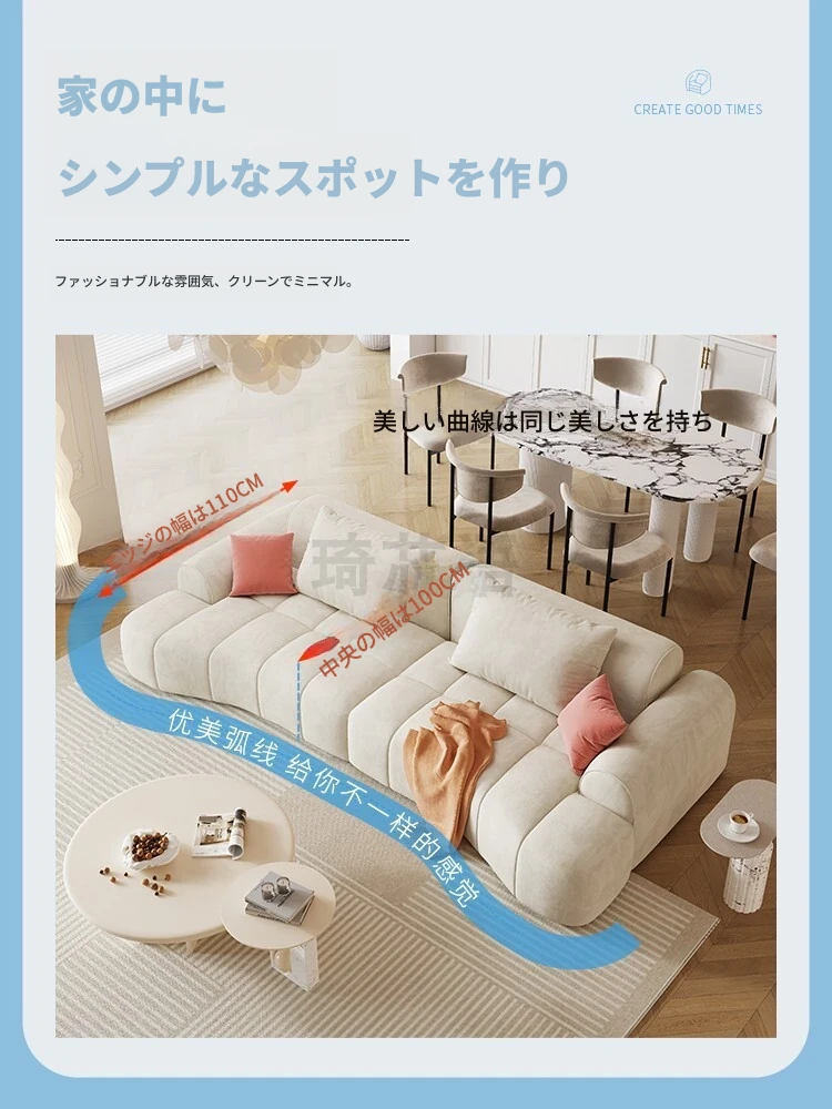 フレンチクリーム風のリビングルーム用ファブリックソファ!小型住宅にぴったりなベビーフランネル製、アーチ型のマシュマロクッション付き。ふわふわのデザインで、心地よい羽毛ソファ!あなたの部屋を優雅に彩ります。