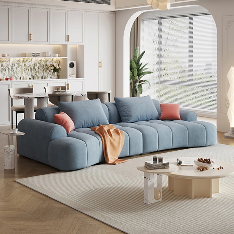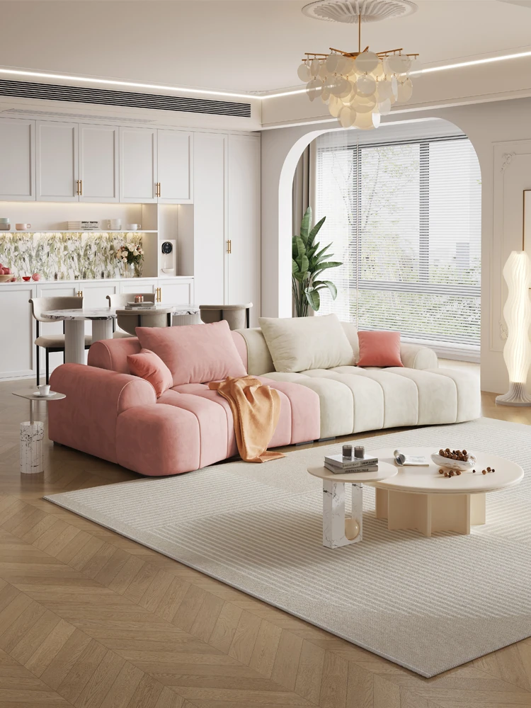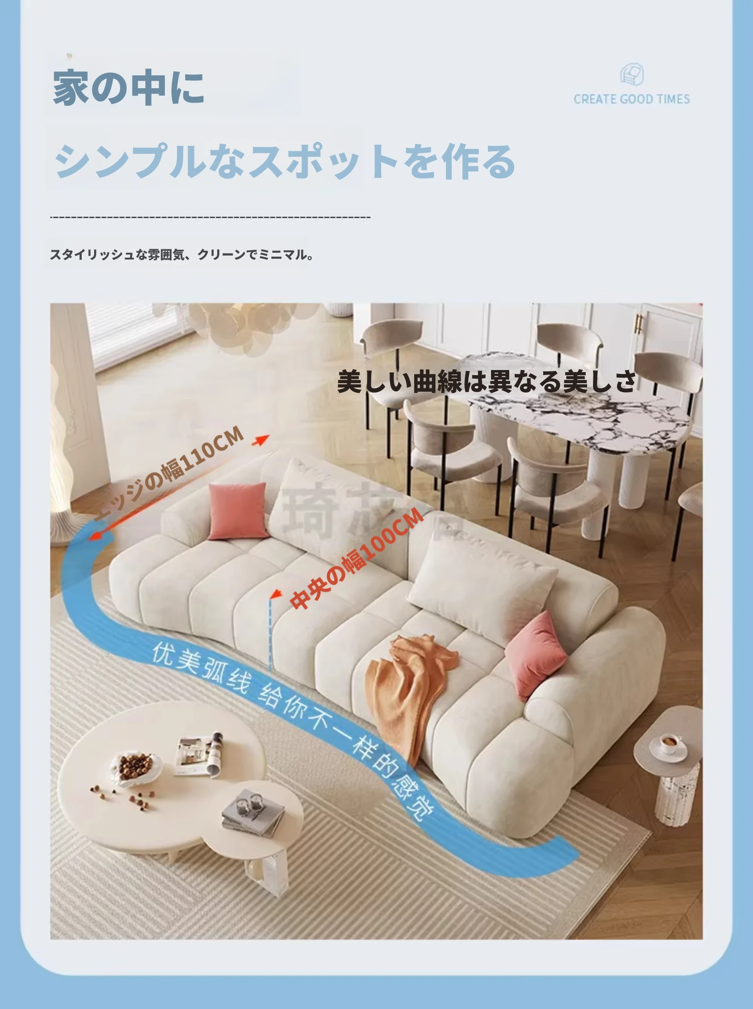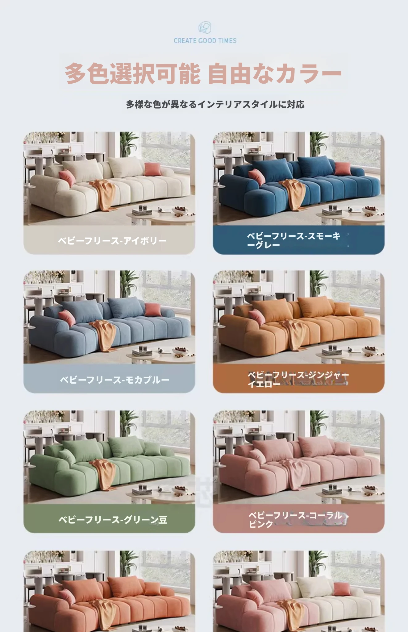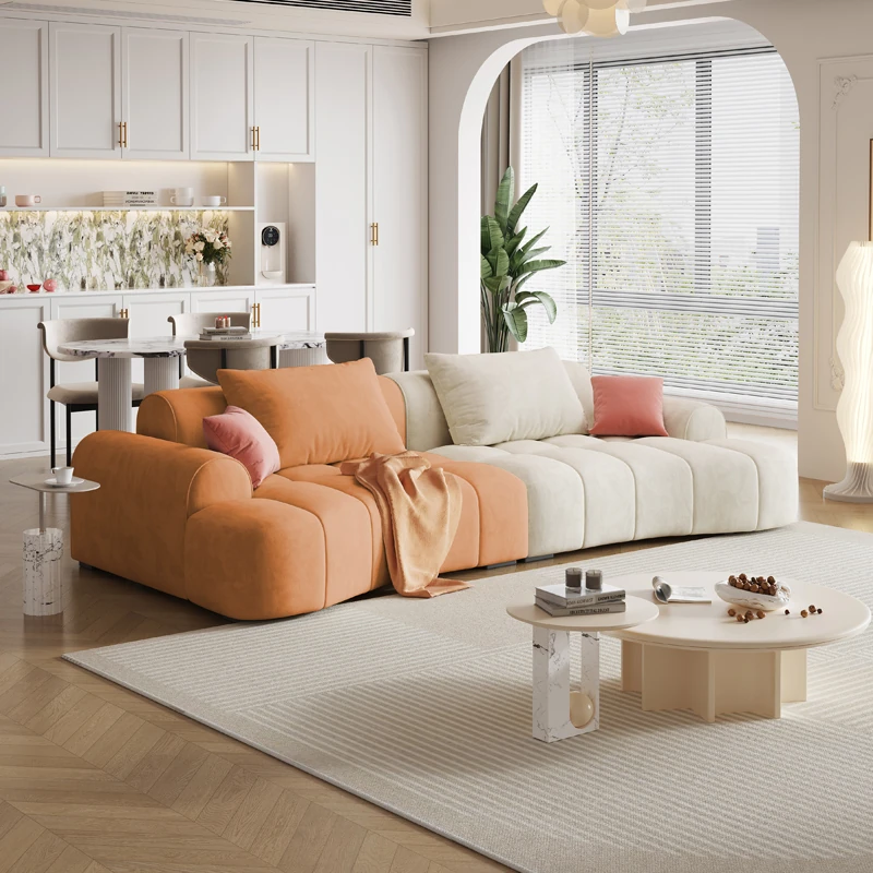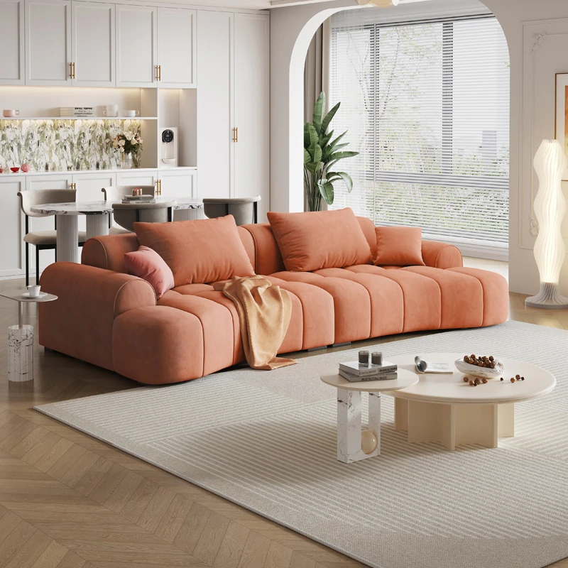 フレンチクリーム風のリビングルーム用ファブリックソファ!小型住宅にぴったりなベビーフランネル製、アーチ型のマシュマロクッション付き。ふわふわのデザインで、心地よい羽毛ソファ!あなたの部屋を優雅に彩ります。