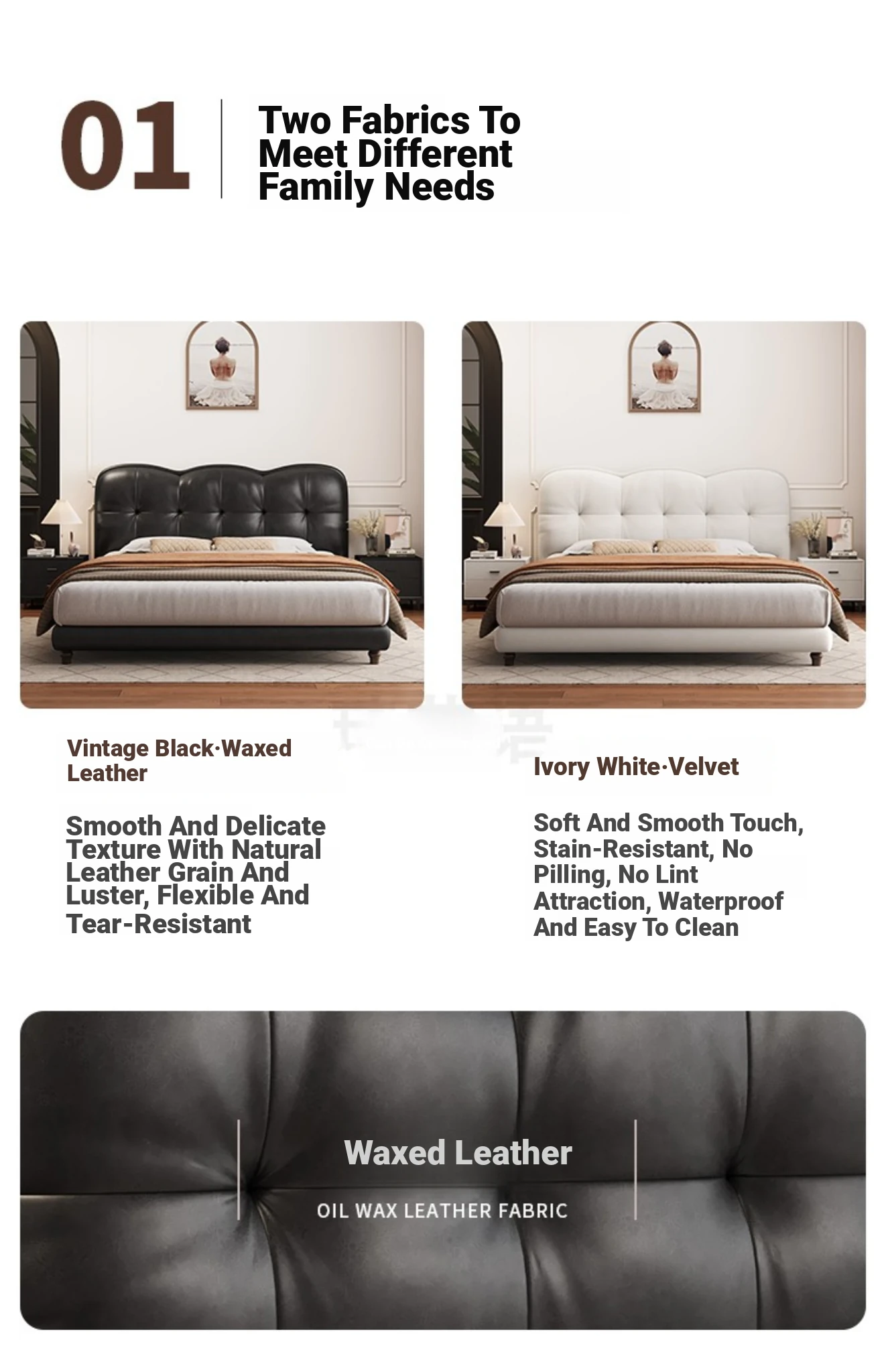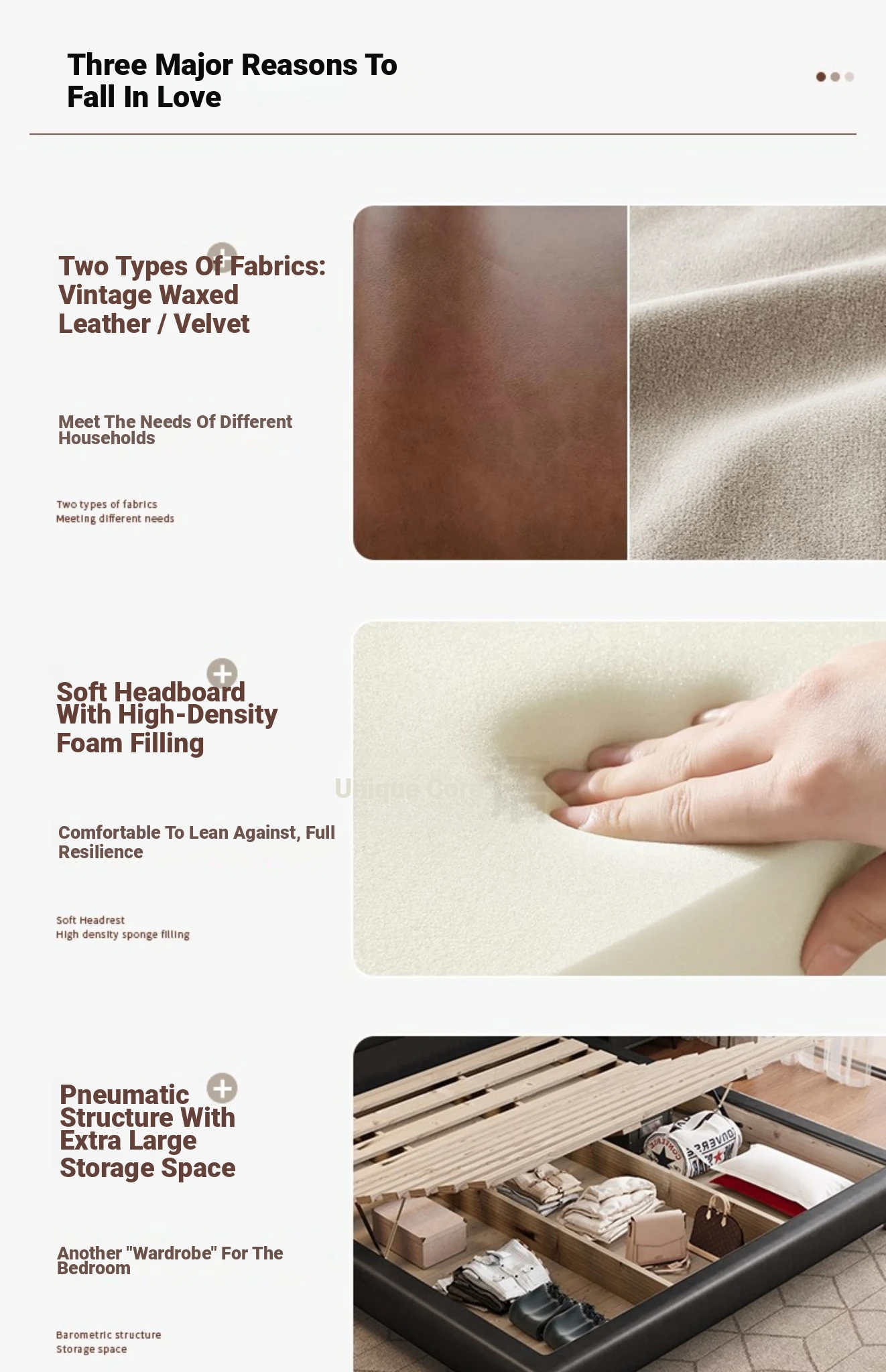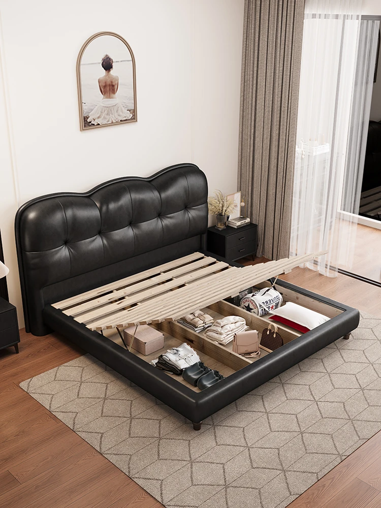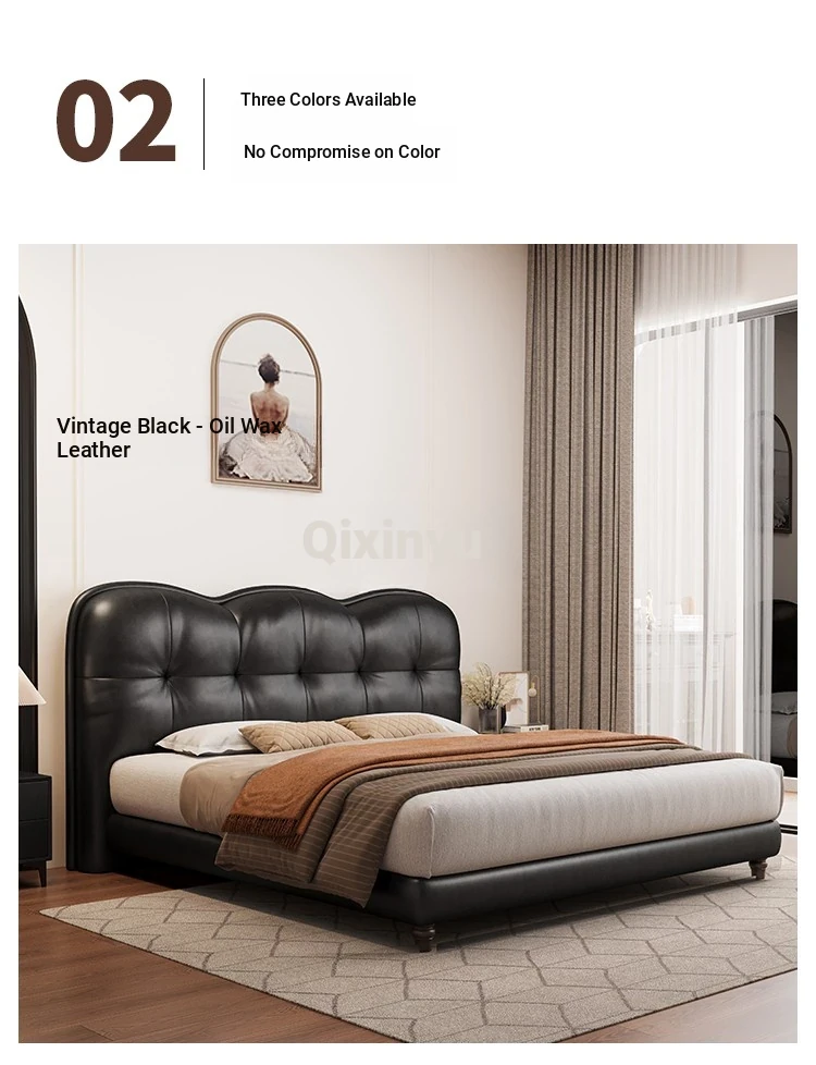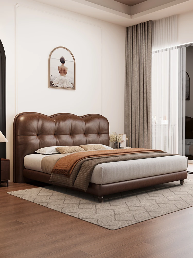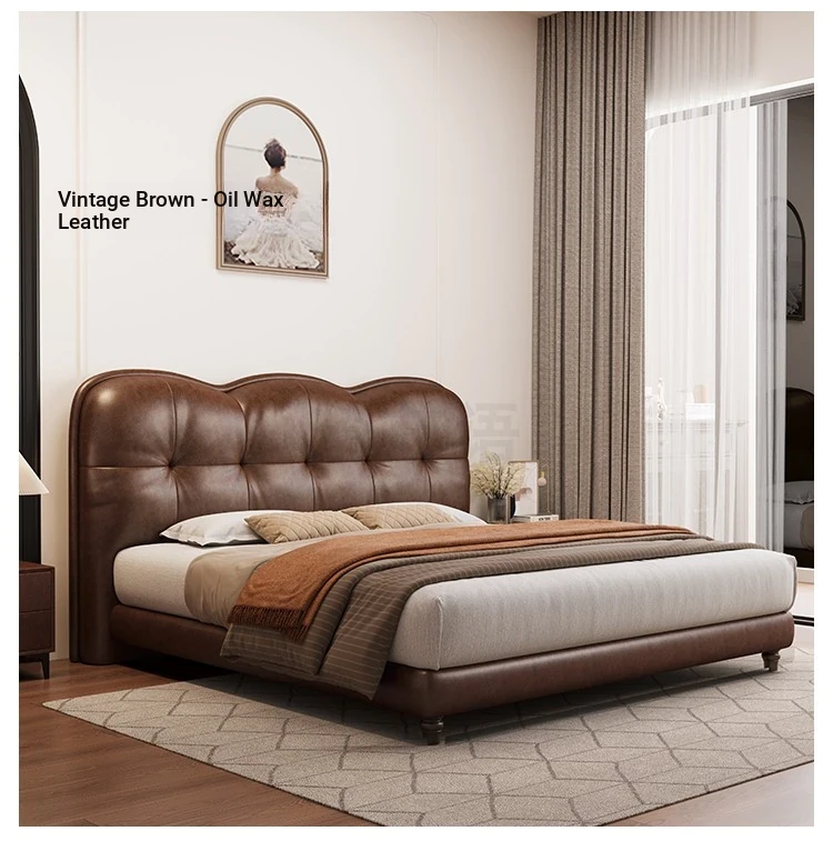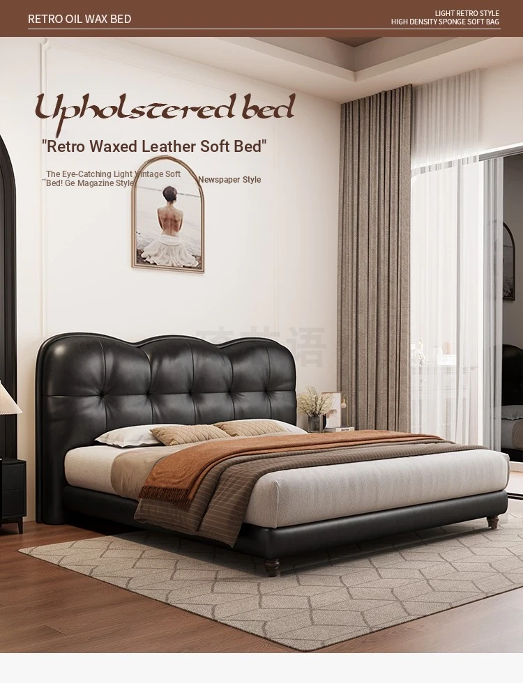 French Vintage Style Upholstered Double Bed with Gas Lift Storage - Elegant Waxed Leather Design for Master and Guest Bedrooms