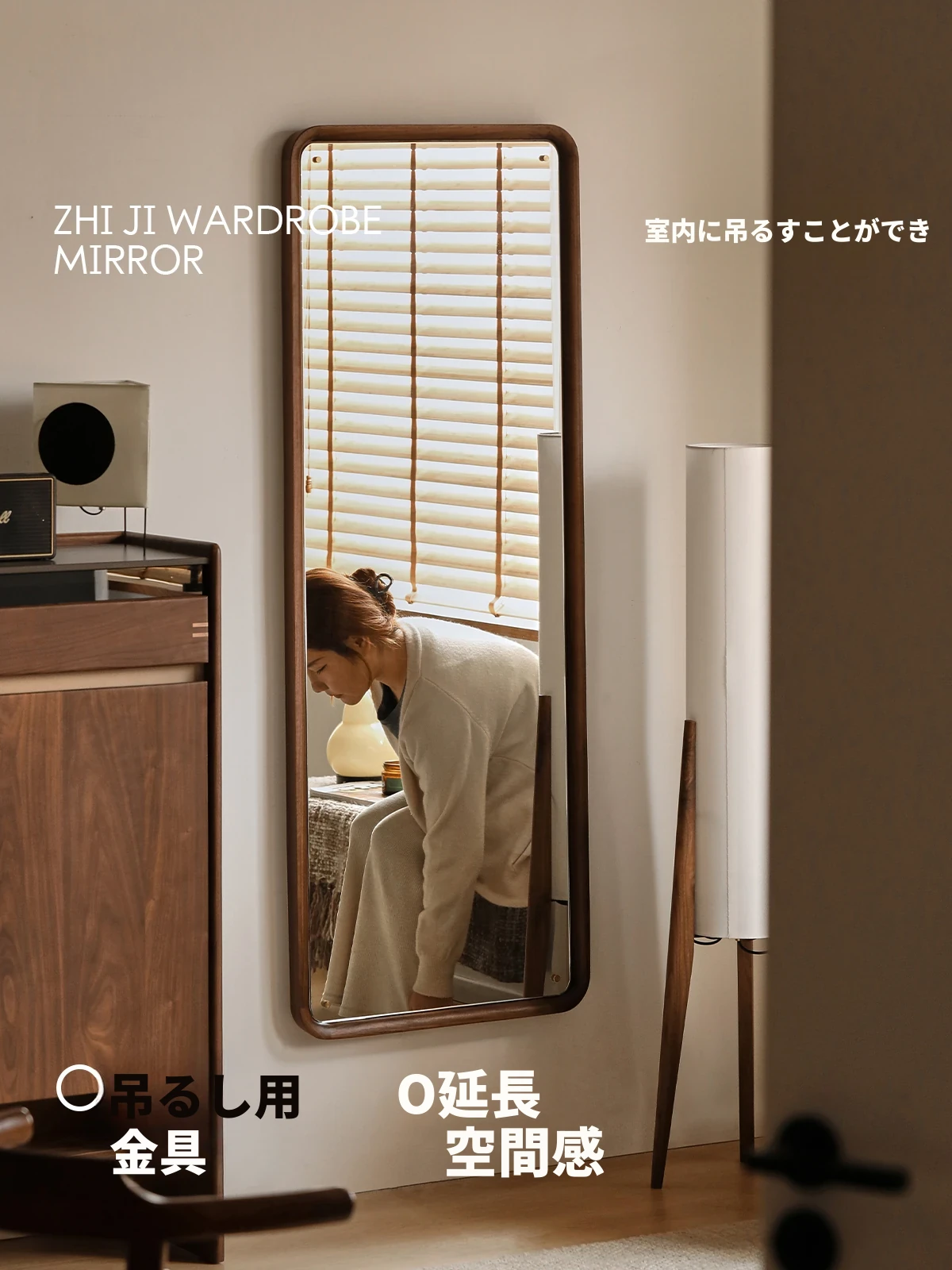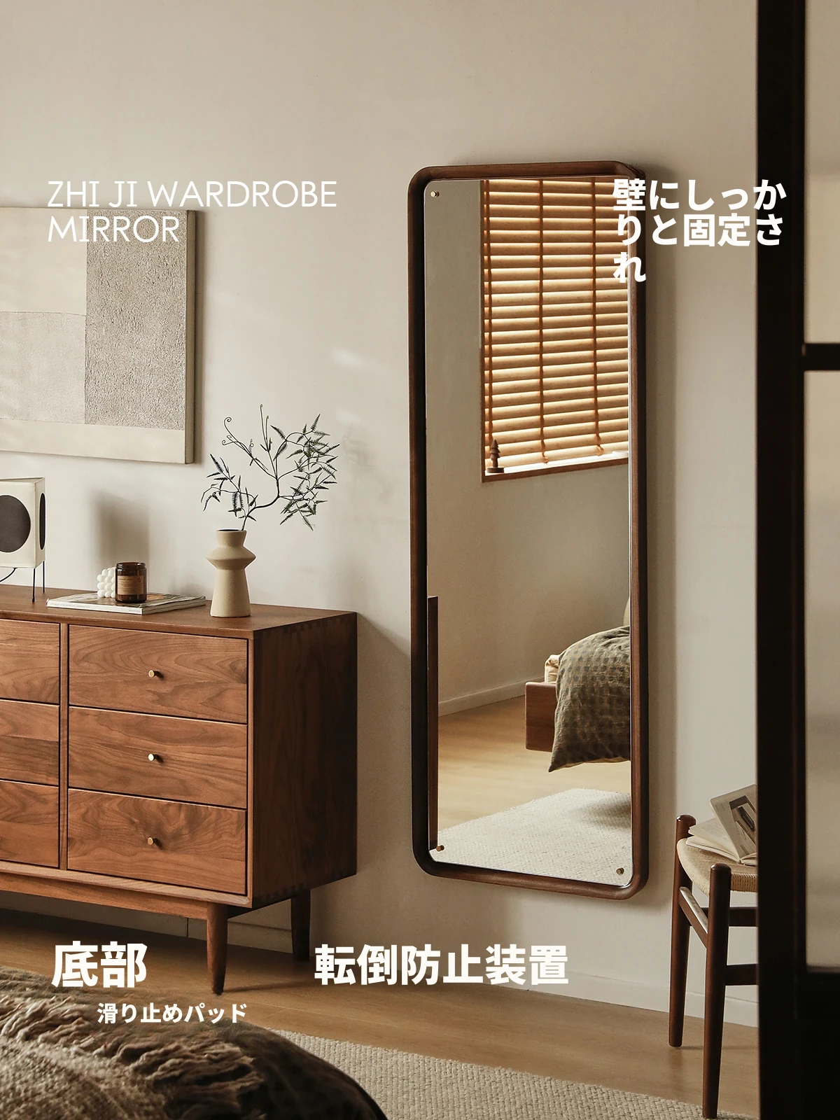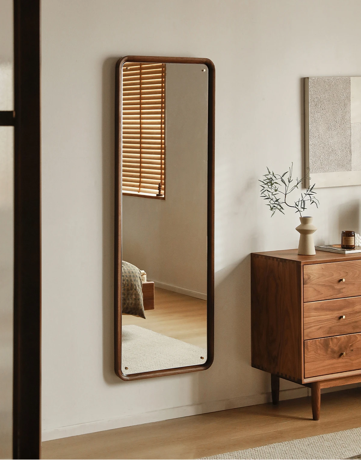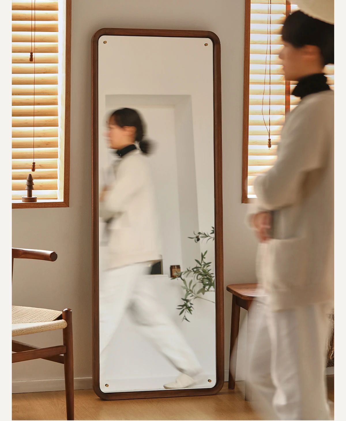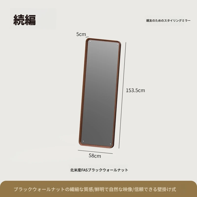北欧スタイルの無垢材全身鏡 - ブラックウォールナット製の立て掛け鏡、壁掛けも可能で、寝室の試着に最適!シンプルで洗練されたデザインで、お部屋をより魅力的に演出します。