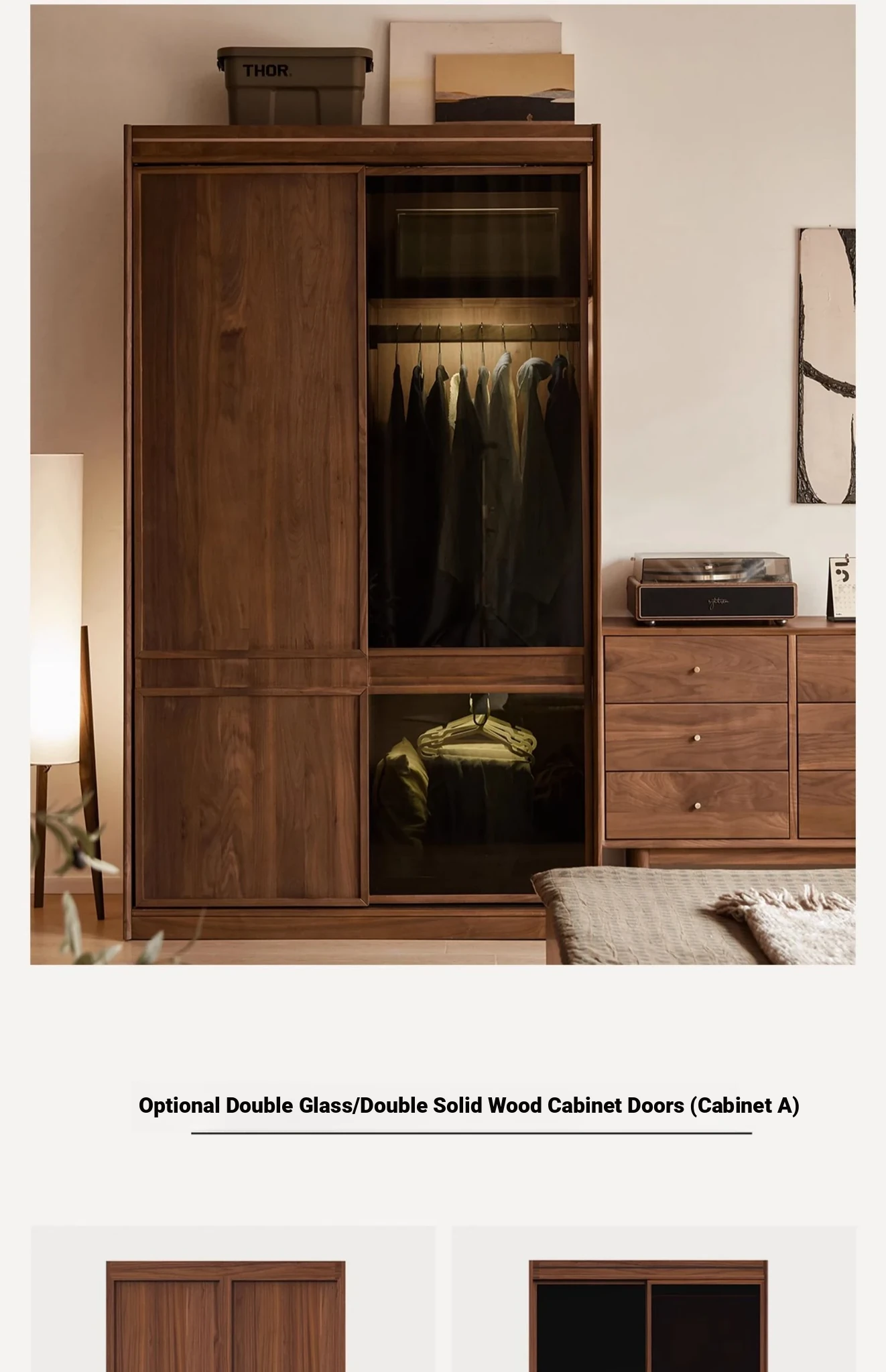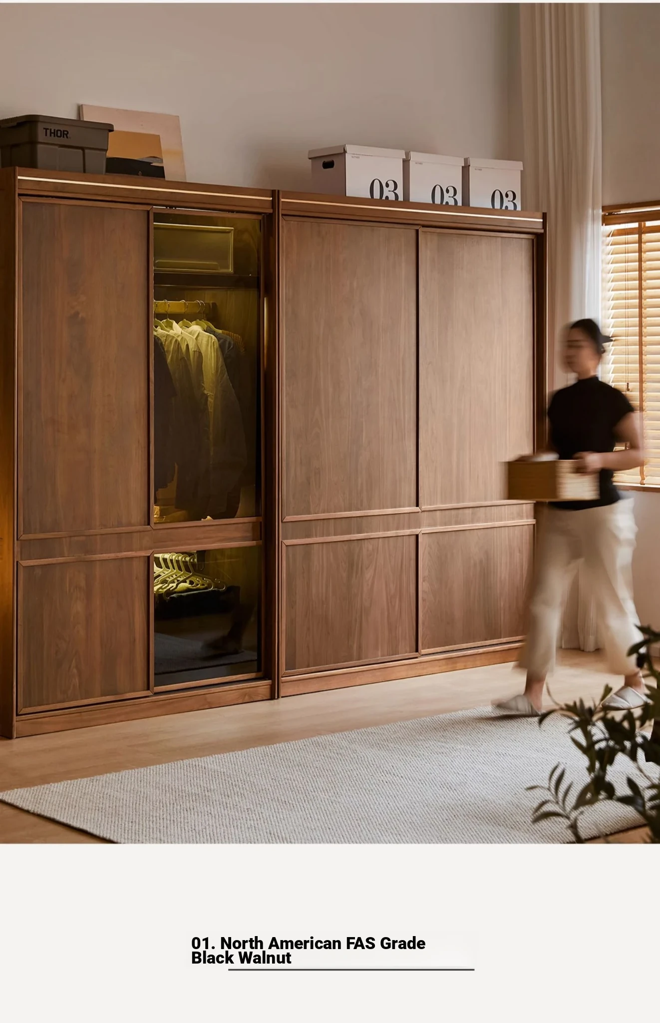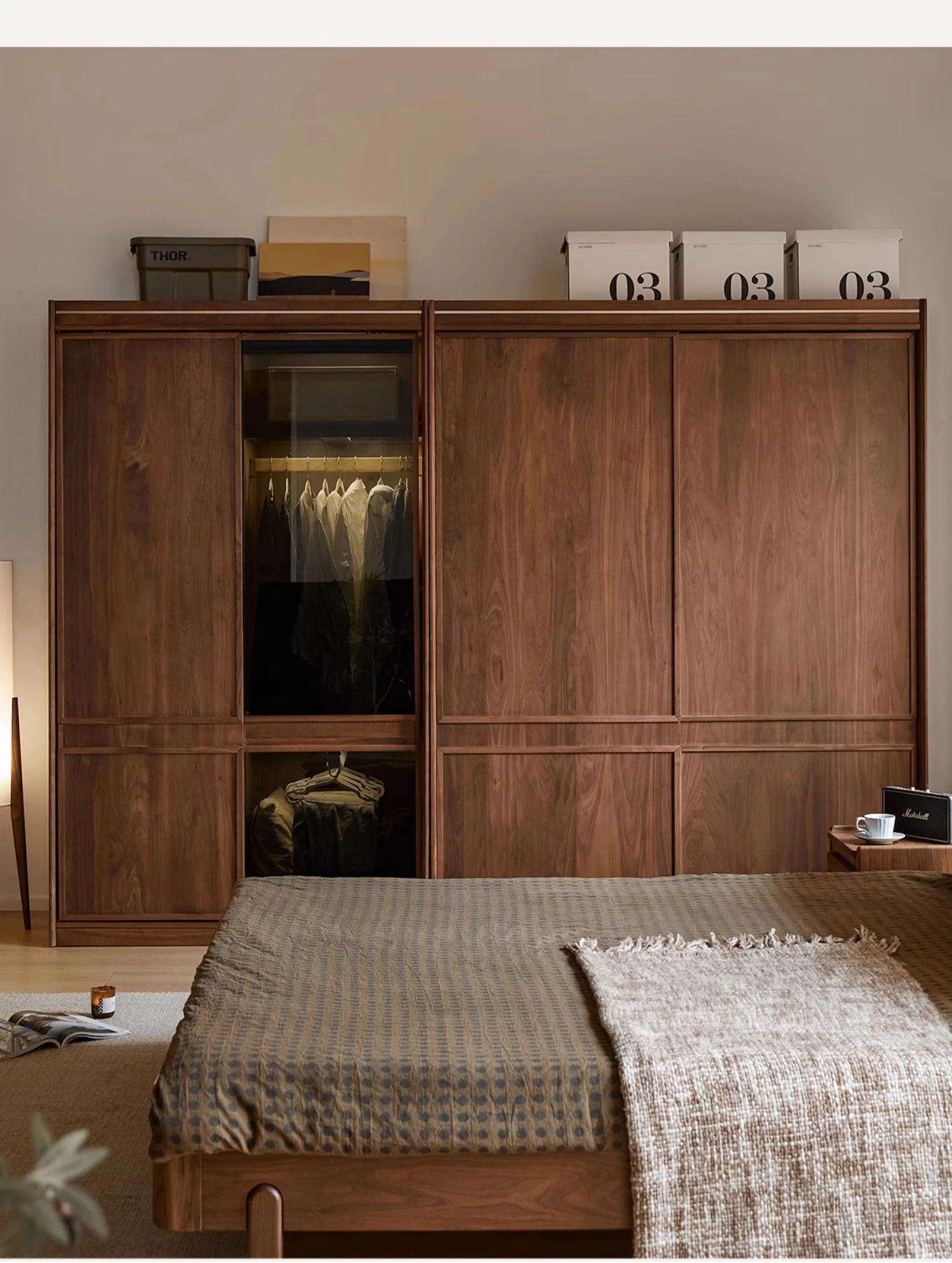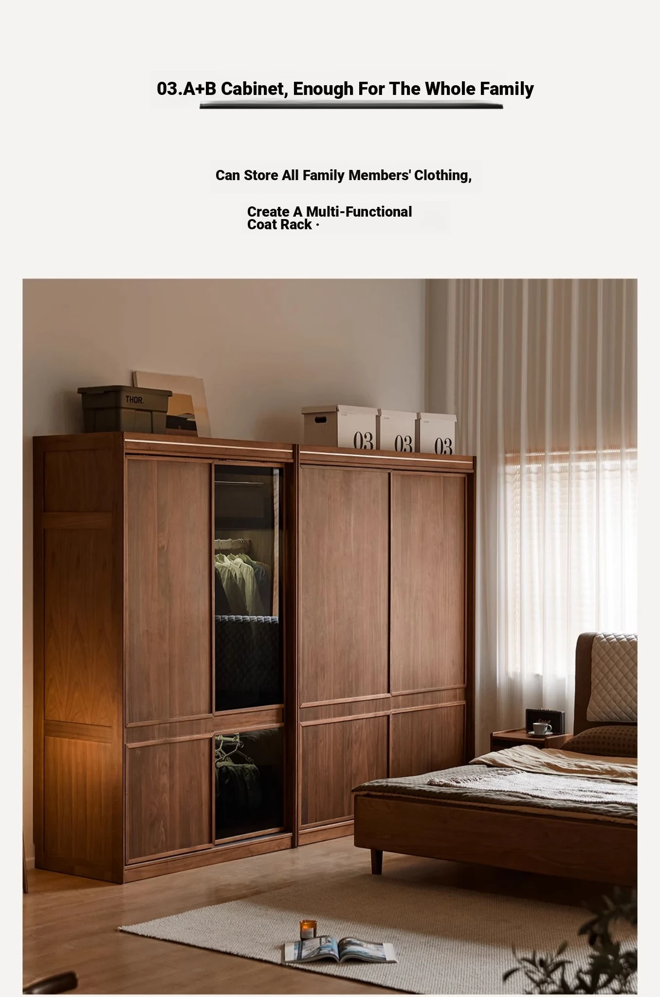 高品質な無垢材使用!ブラックウォルナット製のシンプルでスタイリッシュな移動式クローゼット。あなたの寝室にぴったりの収納力抜群の衣類収納。美しいデザインで、使い勝手も良く、生活空間を引き立てます!
